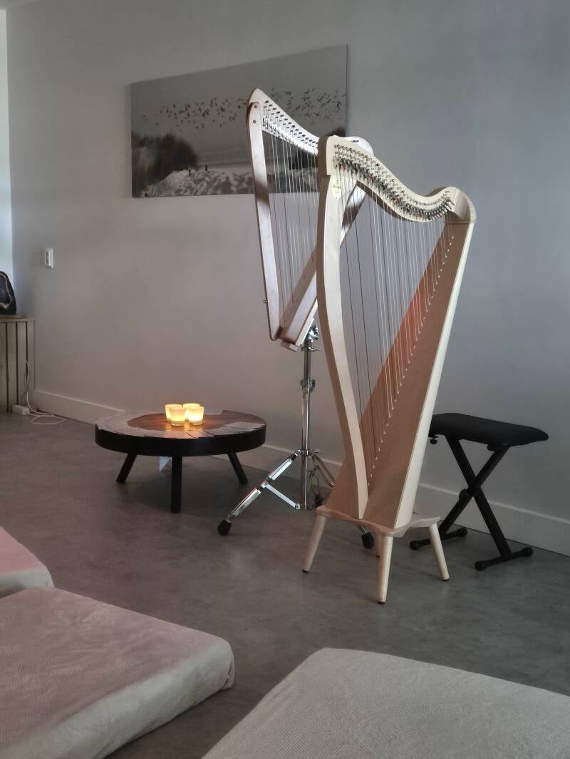 Vanuit een warme en huiselijke setting organiseer ik kleinschalige Soundhealings in groepen van maximaal 4 personen. Tijdens de sessie lig je comfortabel op een matras met dekentje en mag je volledig ontvangen en ontspannen. Er is ruimte voor rust, persoonlijke aandacht en een veilige sfeer. De harp en klankschalen vormen een belangrijk onderdeel van deze ceremonie en worden aangevuld met andere instrumenten. Omdat ons lichaam voor een groot deel uit water bestaat, reageren we sterk op trilling en frequentie. De klanken werken daardoor niet alleen op het gehoor, maar resoneren door in het lichaam en het zenuwstelsel, wat direct rust brengt in lichaam en geest.